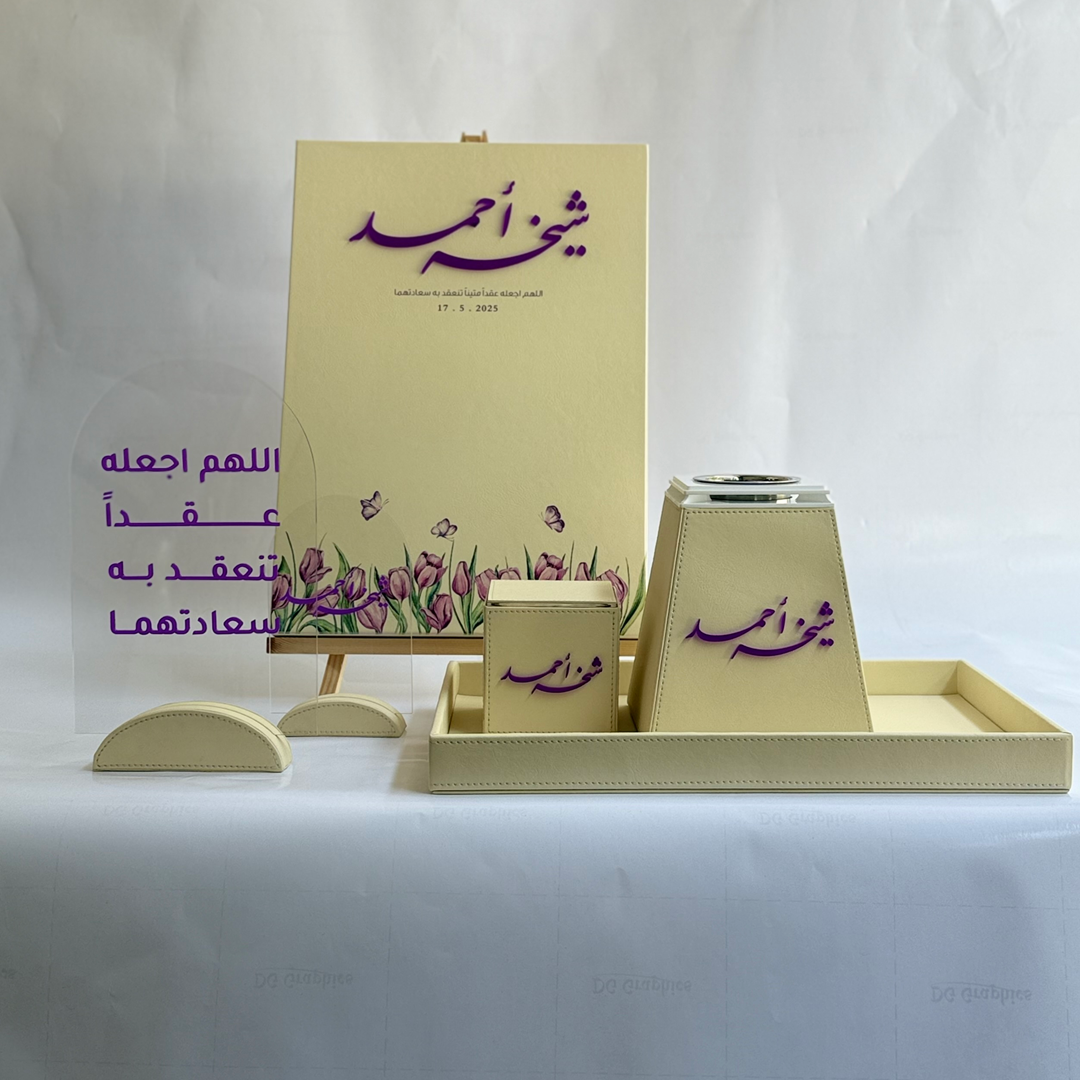 مجموعة تضم نخبة من منتجات مختلفة تتكامل لتشكل منتج اساسي لكل مناسبة. يتكون من:- بورد عقد القران ولوجو الاحرف بالأكريليك.- صينية أنيقة مغلفة بالجلد.- مبخرة وبكس مزينة بلوجو و اسم العروسين.- لوحين اكريليك مع اثنين استاند.- كرت قبلت بالأكريليك.